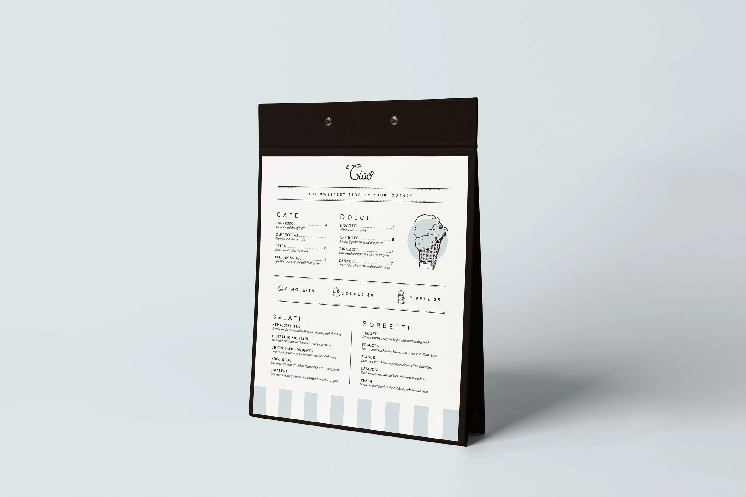 Ciao Gelato is a conceptual food truck project influenced by vintage European packaging design. Its typographic logo reflects the smooth texture of gelato and draws inspiration from traditional Italian signage.