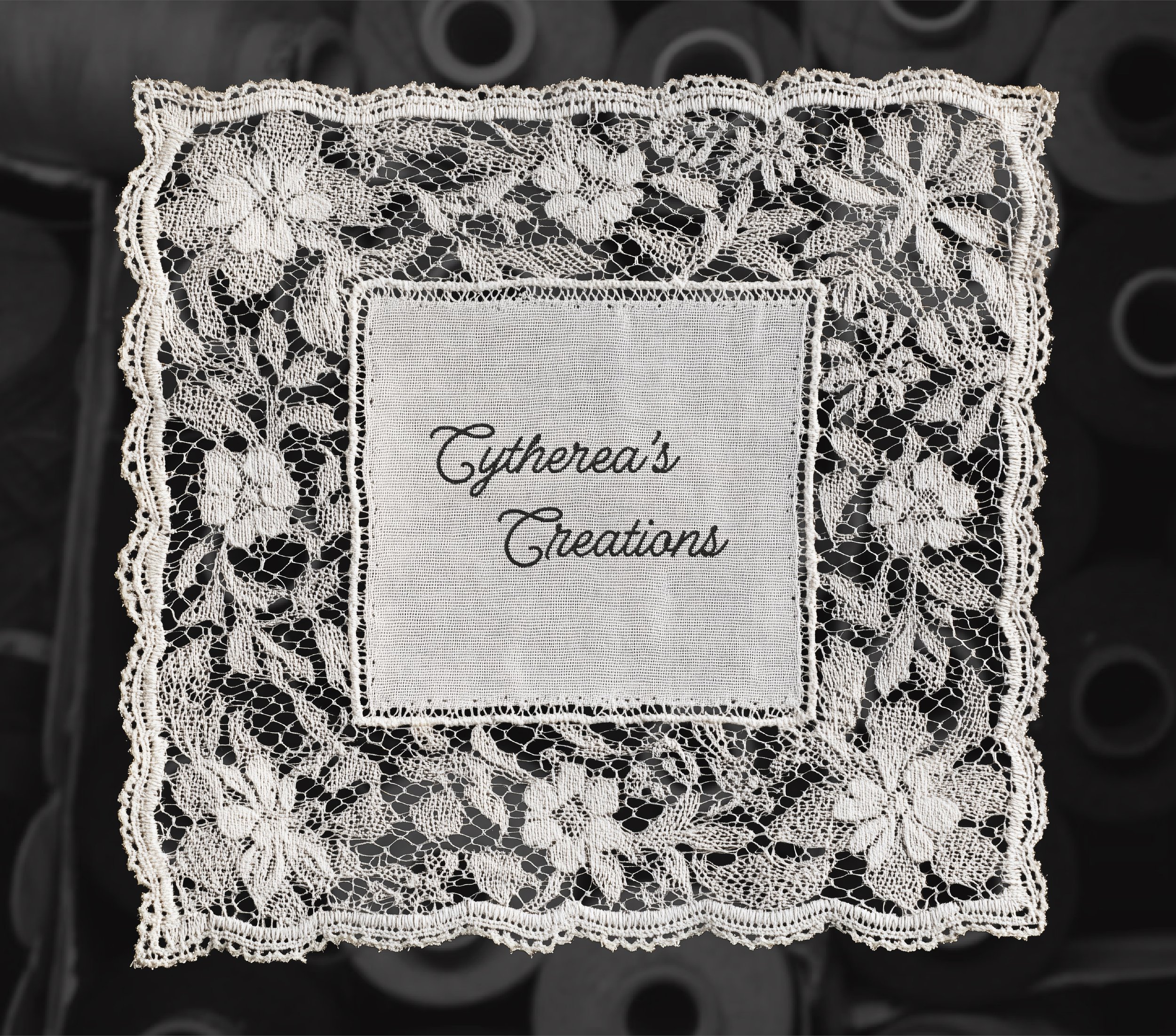 Because Cytherea draws inspiration from classic sewing patterns and her love of old Singer machines, her visual identity leans into a nostalgic aesthetic. To bring this look to life, the design incorporates ornate details, lace elements, and embroidered branding applied to fabric.