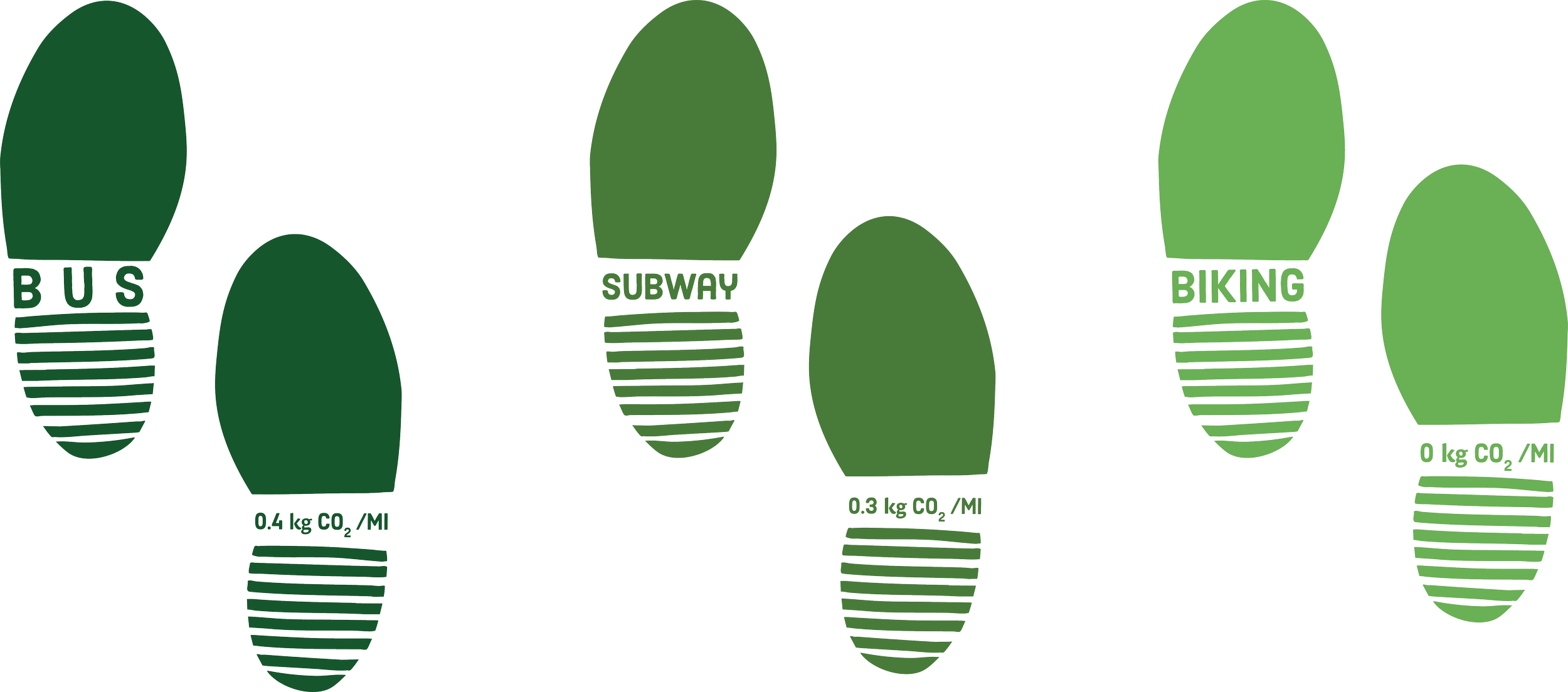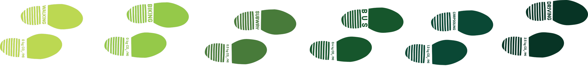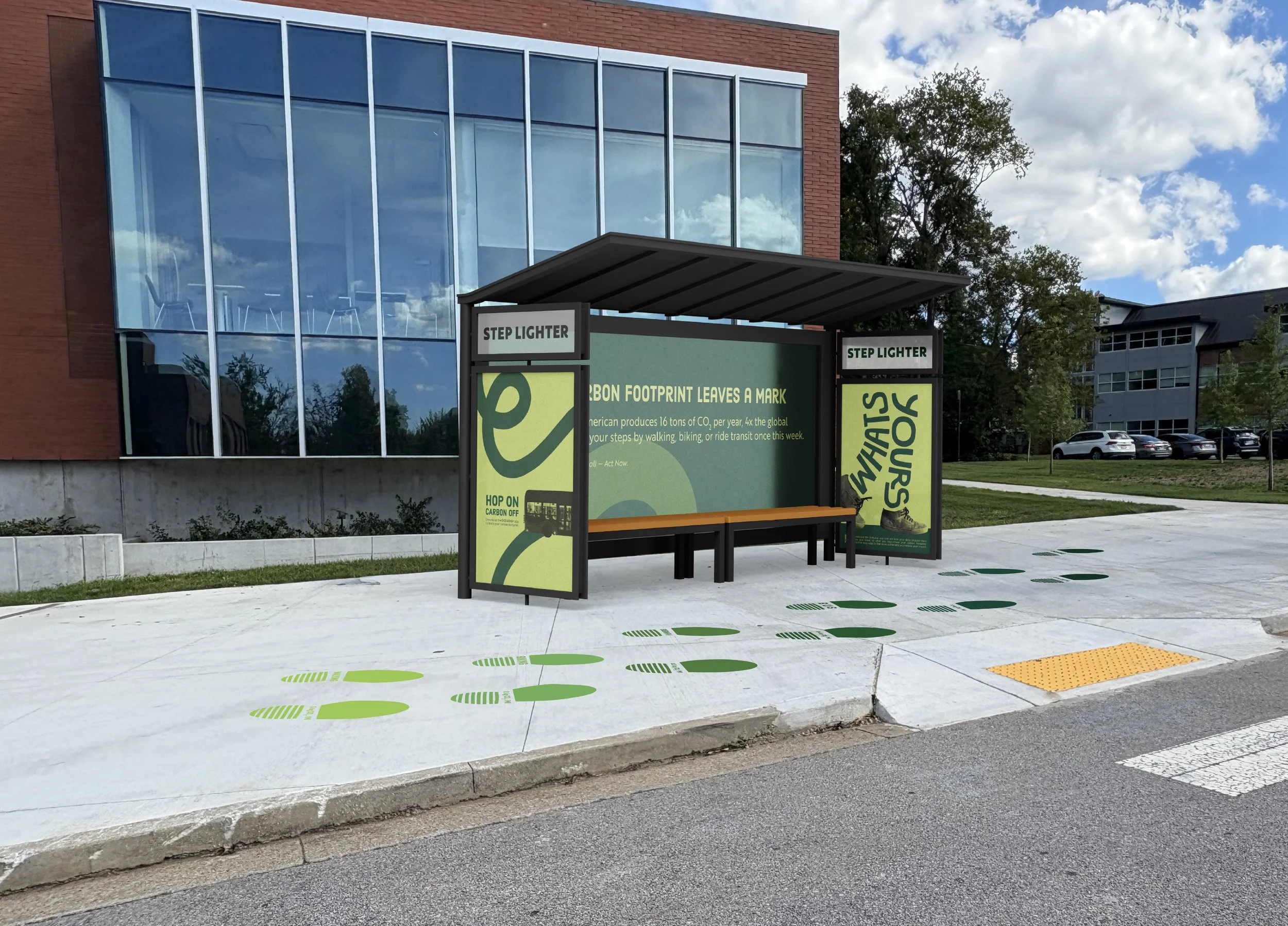 The footsteps on the sidewalk installation range from a light green to dark green based on the mode of transportation. This represents your carbon footprint being lighter or heavier based on your lifestyle choices.