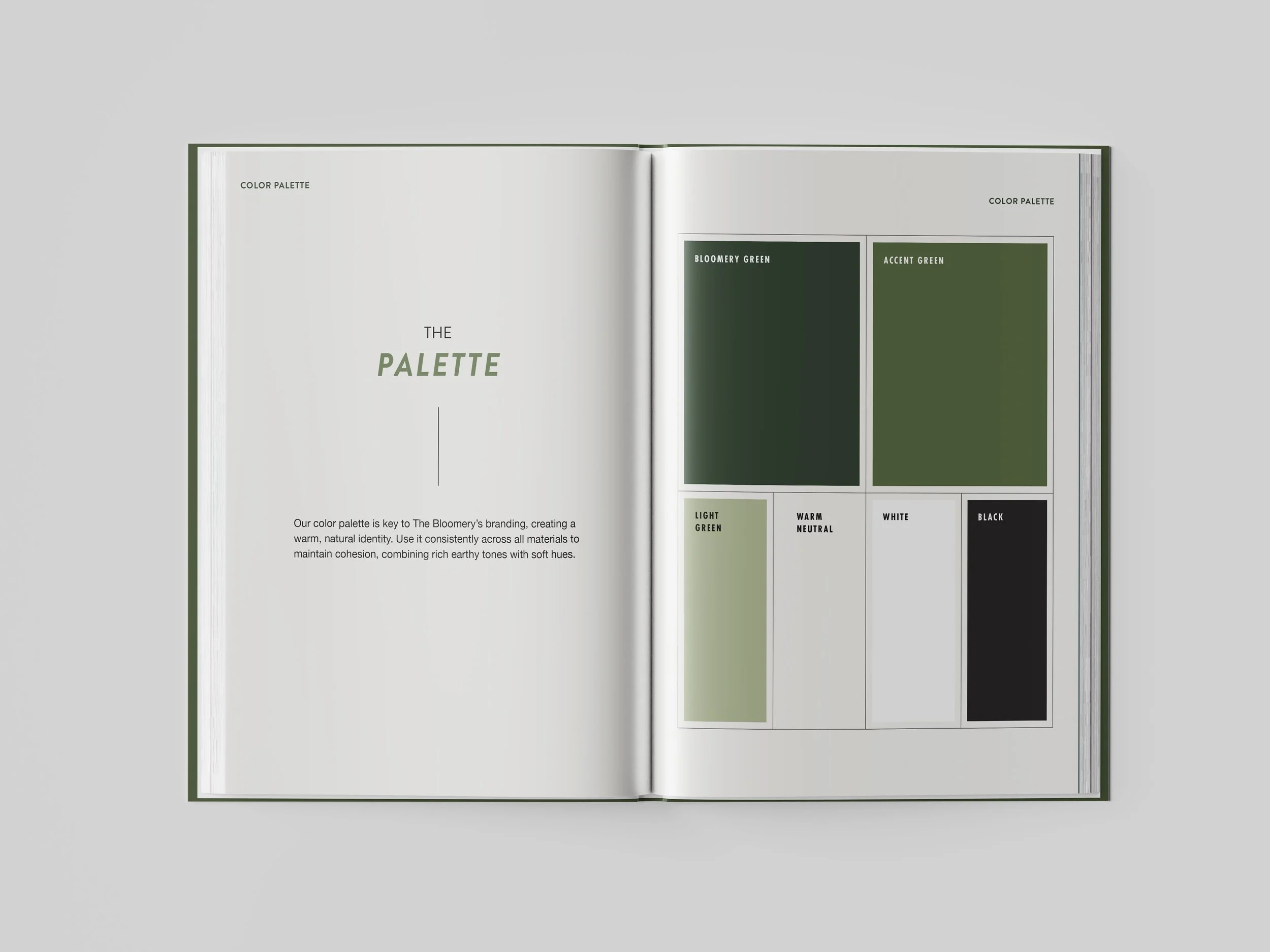 The color palette combines rich greens with soft, creamy neutrals. These earthy hues echo the natural materials and calm atmosphere at the heart of the brand.